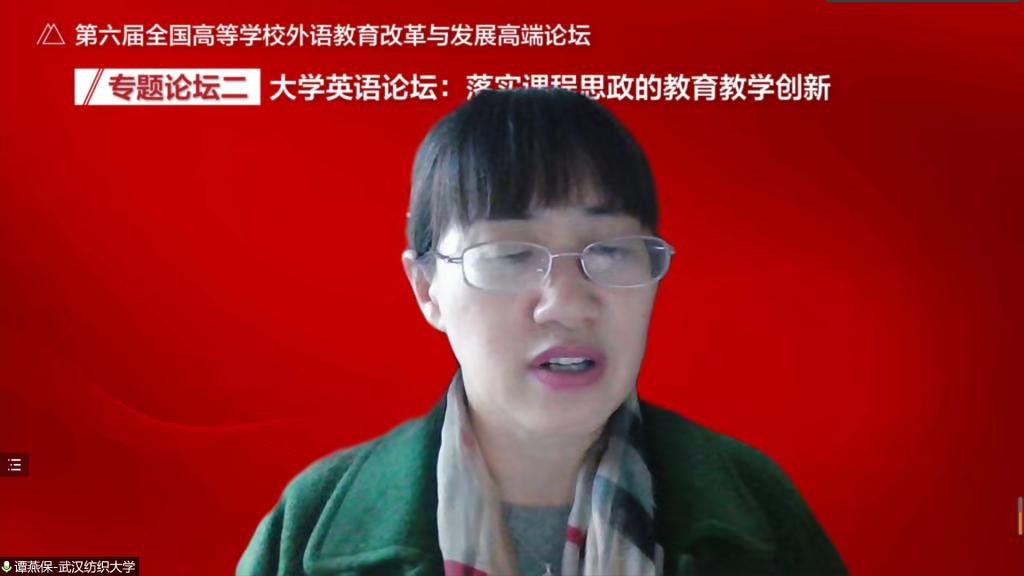 谭燕保教授从学理和实践两个维度阐述了英语教育中如何来培养学生的国家意识与国际视野。她指出,学生的国家意识与国际视野是积极参与全球治理的必然需要,是英语课程思政的深入体现,更是中国学生传播中国文化和中国智慧的责任担当。她以研究者的身份,参考了大量的文献,在已有研究成果的基础上,提出了自己的独到见解:外语课程思政具有很强的学科优势,具有直接性﹑可接受性和上手性。此外,在实践层面上,她以ok138cn太阳集团529英语教学为例,阐述了思政内容挖掘、思政方法设计及思政环境营造三个方面的实施路径和过程,并展示了近两年学院所取得的丰硕成果。谭燕保教授的报告从宏观和微观两个方面阐释了外语类课程思政的全新内涵,对其他同类高校的外语思政教学有很好的示范和借鉴意义。