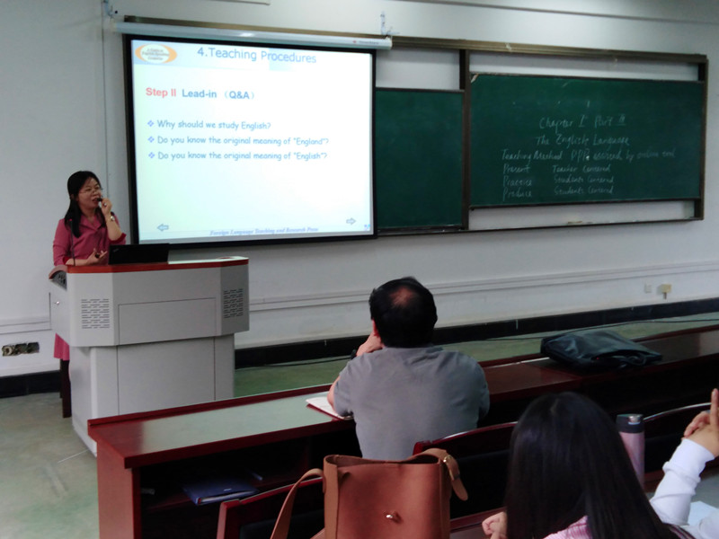 申颖老师以“英语语言拓展---英语国家概况”教程的第一章(英语的发展)为例,先后介绍了教材与内容选择、教学方法运用、教学目标设定及教学步骤。