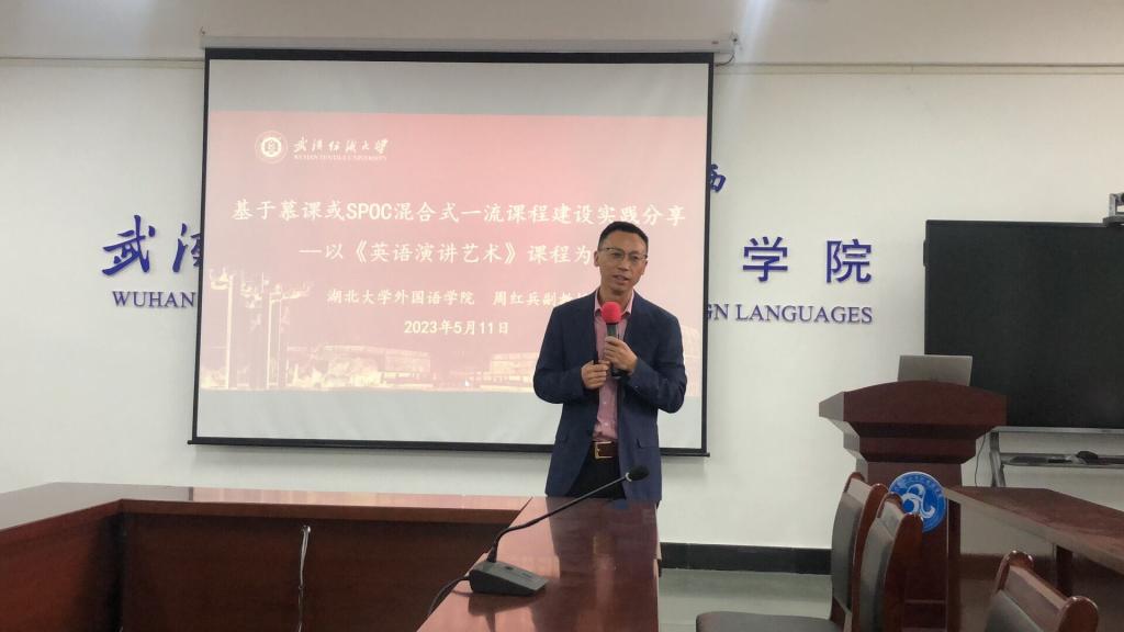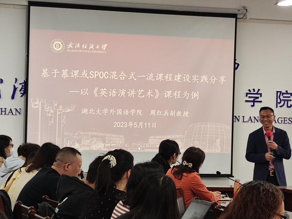 5月11日下午,在学院301会议室,来自湖北大学ok138cn太阳集团529的周红兵教授为全院教师做了一场精彩的讲座,题目为:混合式课程设计的路径与教学创新手段提升的方法,讲座由副院长刘方荣主持。周教授是教育部本科线上一流课程及混合式一流课程评审专家,湖北省演讲协会英语演讲专业委员会主任委员,此次是受学院领导的邀请来作经验分享和课程申报指导,旨在提升学院的一流课程申报质量。