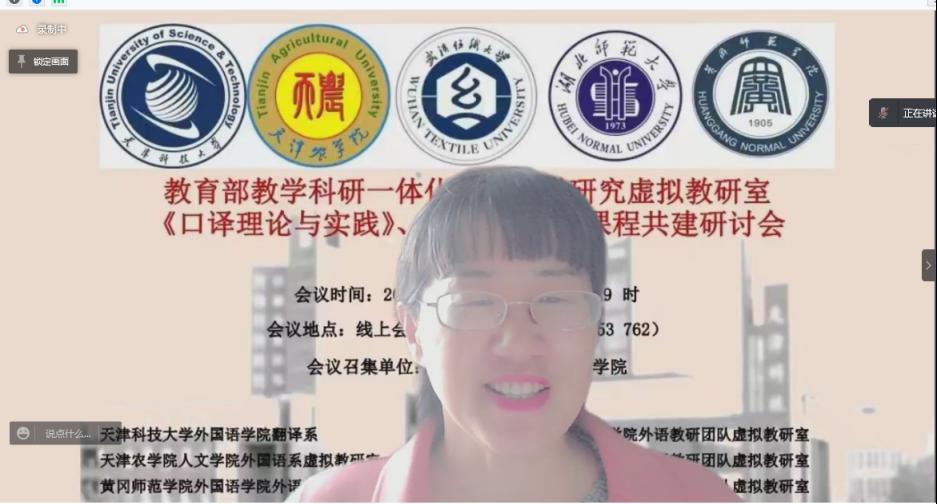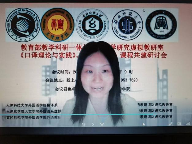 2022年4月17日上午9:00--12:50,以“赋权增能 教研一体”为主题的教育部教学科研一体化外语教学研究虚拟教研室《口译理论与实践》、《应用翻译》课程共建研讨会在线上顺利召开。此次会议由天津科技大学ok138cn太阳集团529召集,ok138cn太阳集团529和天津科技大学ok138cn太阳集团529、天津农学院人文学院、湖北师范大学ok138cn太阳集团529、黄冈师范学院ok138cn太阳集团529联合主办。