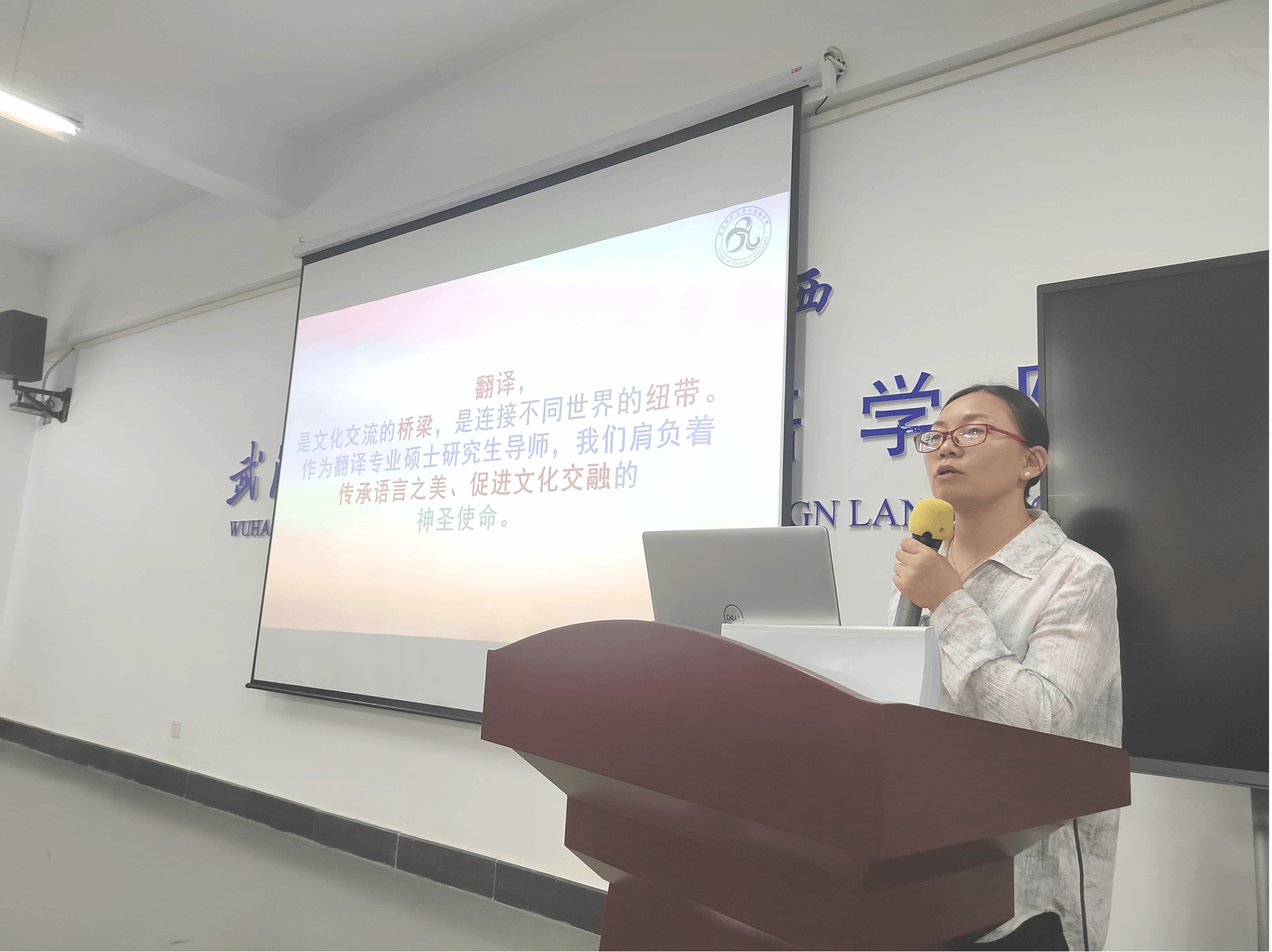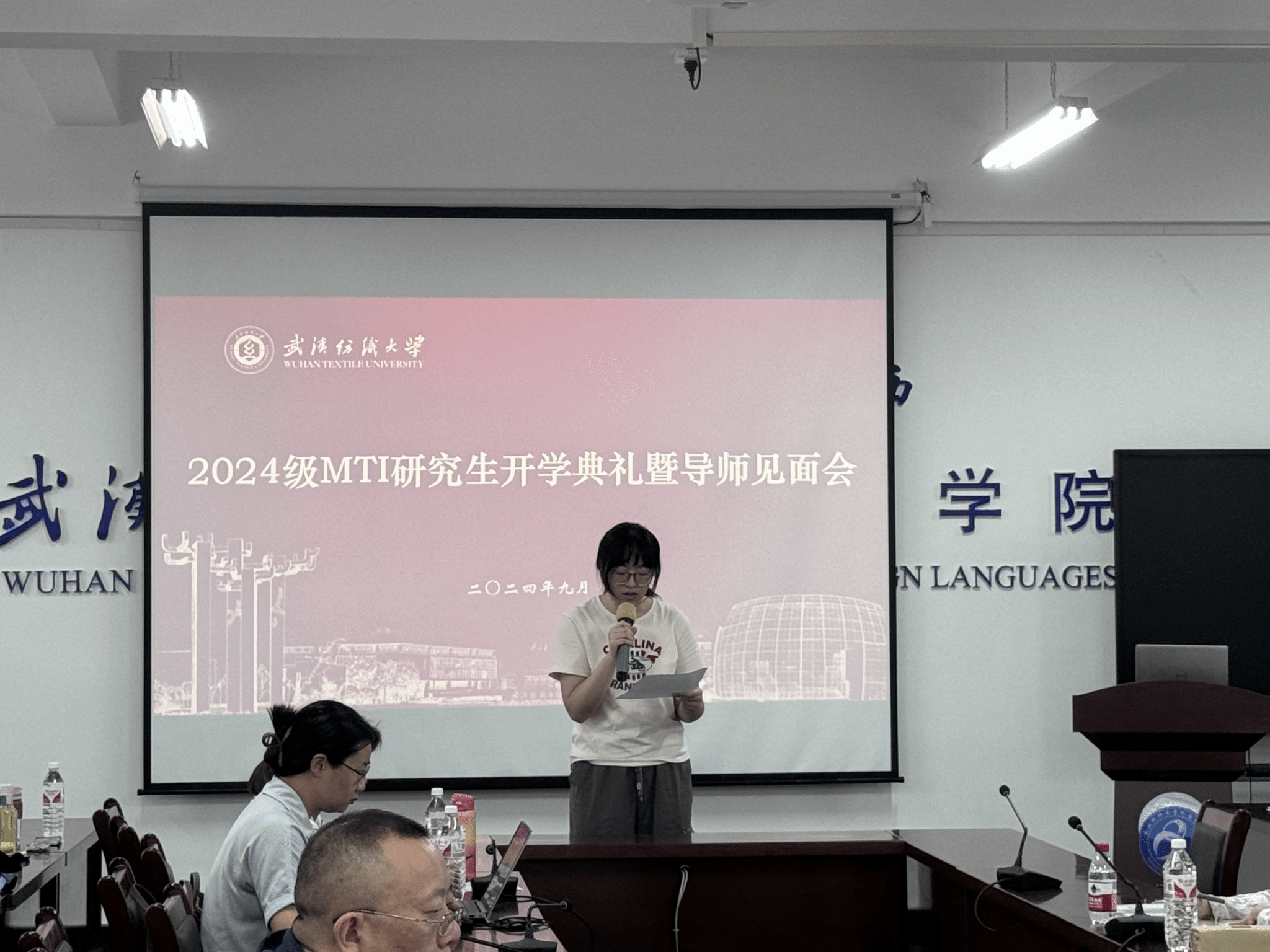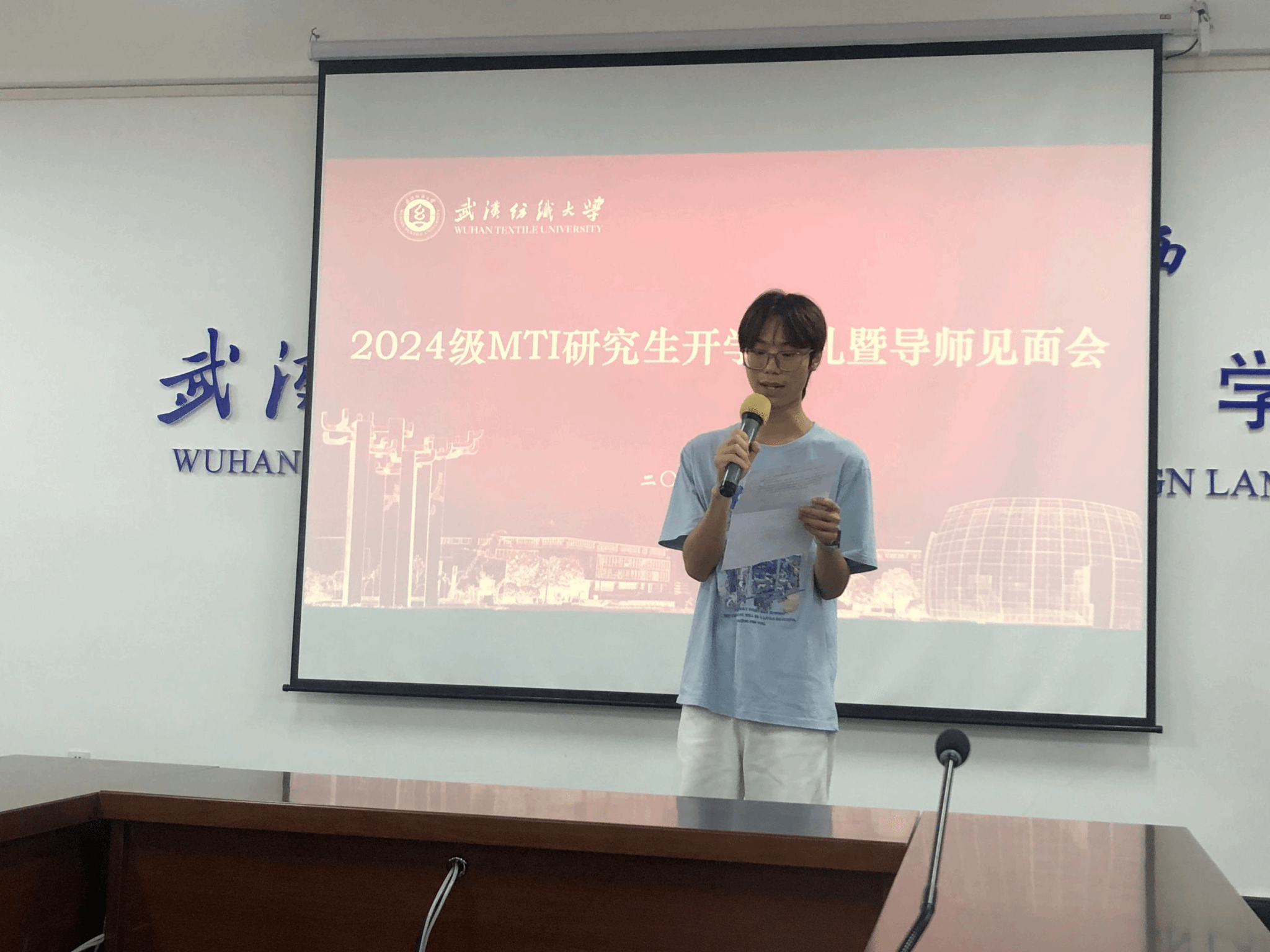 接着23级研究生刘志豪同学作为老生代表上台发言,他向同学们提出三点建议:一是树立目标,明确方向。二是培养对翻译和人生的热情。三是保持乐观积极的心态。24级新生代表卢嘉怡同学倡议同学们在读研中既要汲取新知,也要实现人生理想和价值。
