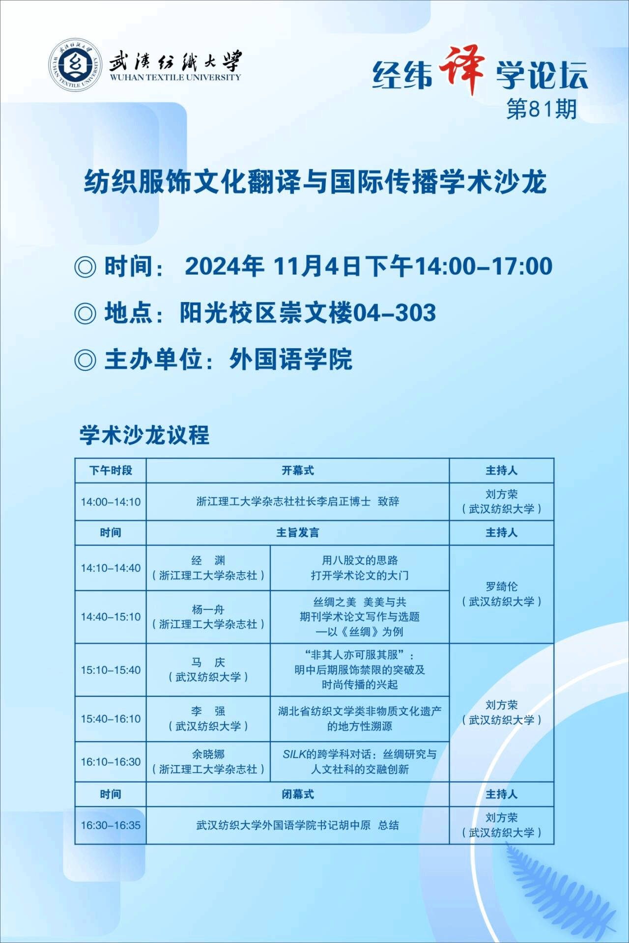 11月4日下午,ok138cn太阳集团529举办了以“纺织服饰文化翻译与国际传播”为主题的学术沙龙。本次沙龙特别邀请浙江理工大学杂志社副社长经渊、学术期刊《丝绸》副主编杨一舟、SILK编辑余晓娜,以及我校传媒学院副院长马庆、期刊社副编审李强作主旨发言。22级、23级及24级MTI研究生参加了此次沙龙。活动由ok138cn太阳集团529副院长罗绮伦和刘方荣主持。