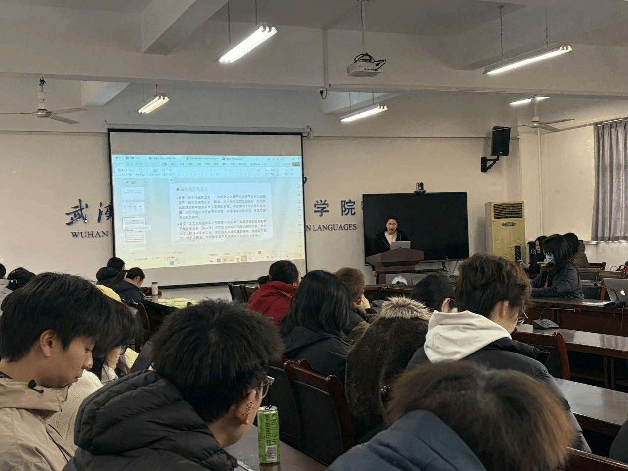 12月30日,ok138cn太阳集团529第104期“经纬译学”研究生论坛在崇文楼303会议室举行。本期论坛特邀华敏、吴凤竹两位老师共同担任点评嘉宾,2025级MTI研究生姚芊芊担任学生主持,2024级和2025级研究生共同参加了此次论坛活动。