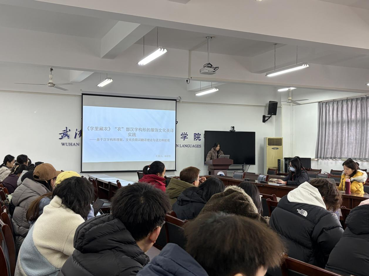 最后,2025级MTI研究生邱君怡围绕《〈字里藏衣〉中“衣”部汉字构形的服饰文化英译实践——基于汉字构形理据、文化负载词翻译理论与语义映射观》这一主题 ,聚焦《字里藏衣》中的材质型、形制型、结构及隐喻类“衣”部核心汉字,先解码字形中蕴含的服饰特征与文化内涵,再结合相关理论精准定位英译中的适配障碍,通过译例对比提炼针对性翻译策略,最终实现汉字构形理据、服饰专业语义与文化意象的三维对应,为同类服饰文化负载词的跨文化翻译提供了兼具理论支撑与实践价值的参考。