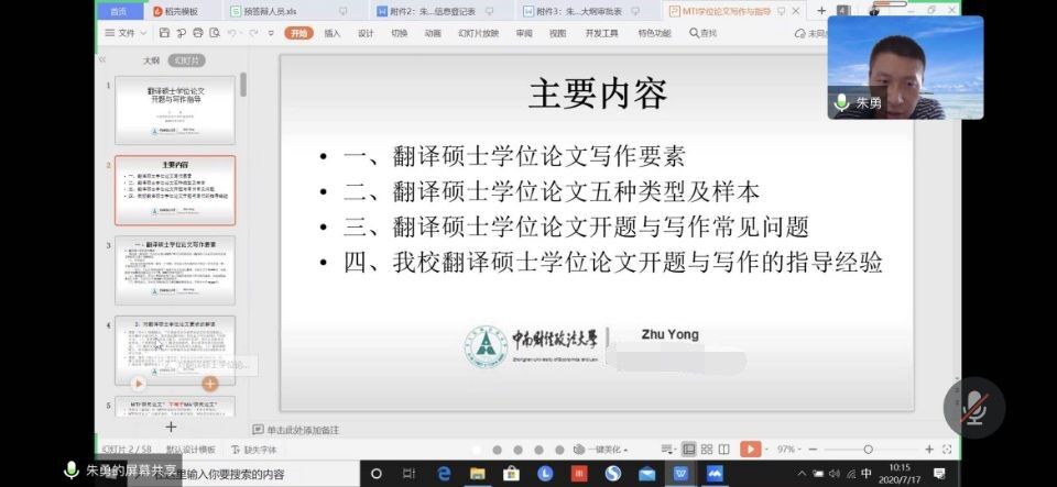 为推进我院MTI人才培养工作,提高硕士生导师翻译硕士学位论文的指导水平,7月17日上午,学院邀请中南财经政法大学ok138cn太阳集团529MTI中心主任朱勇副教授莅临云端,就翻译硕士学位论文的各方面相关工作展开培训与释疑,谭燕保院长、MTI教育中心全体硕士生导师和部分任课教师在云端参会。会议由柯群胜副院长主持。