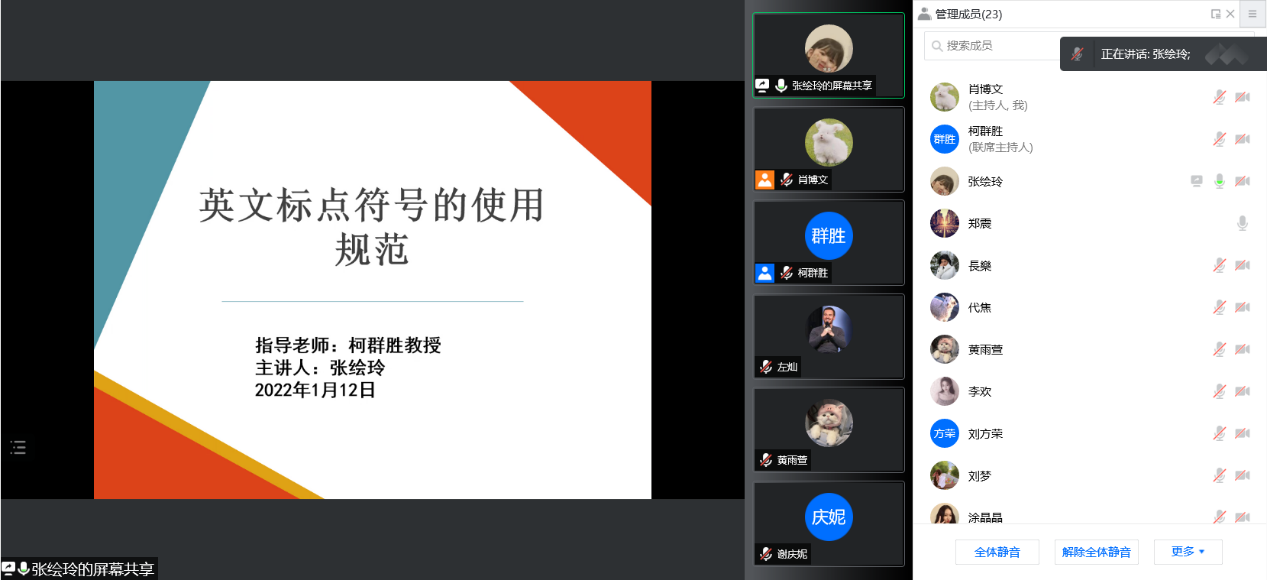 张绘玲同学分享的主题是英语标点符号的使用规范,共讲到了十一种英文标点,以及四种容易被混用的中英文标点。每一种标点都举了许多例子让同学们来进行辨析,也标注出了容易在哪些地方产生误用,帮助大家更了解如何规范使用英文标点符号。