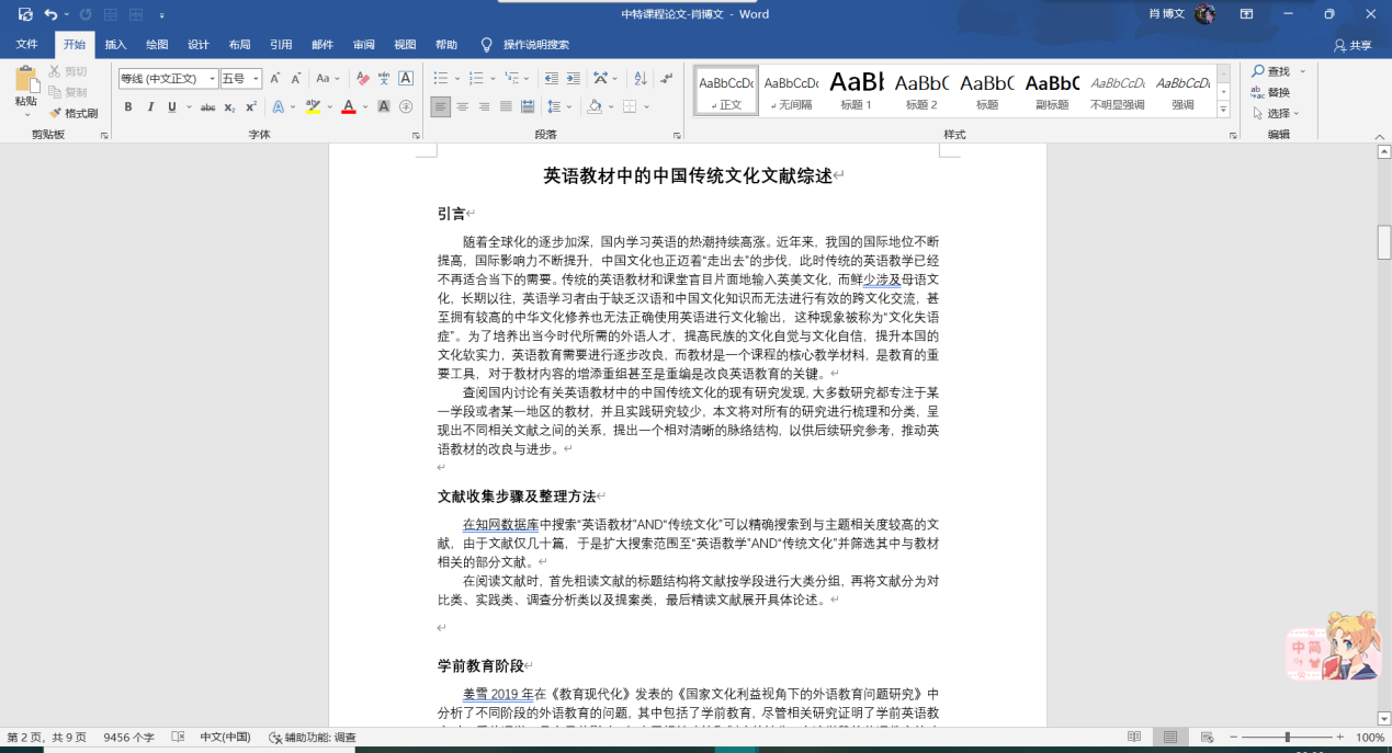 肖博文同学分享的主题是“英语教材中的中国传统文化”文献综述,内容分为两个部分。在第一部分介绍了为什么要做文献综述以及怎样做文献综述,其中提到了柯院长推荐的《怎样做文献综述——六步走向成功》一书,其中详细讲解了如何写好一篇文献综述;第二部分讲到了她做的文献综述,将教材按阶段进行分类并总结各篇观点最后进行总结得出哪些点是研究不够到位、存在研究价值的。