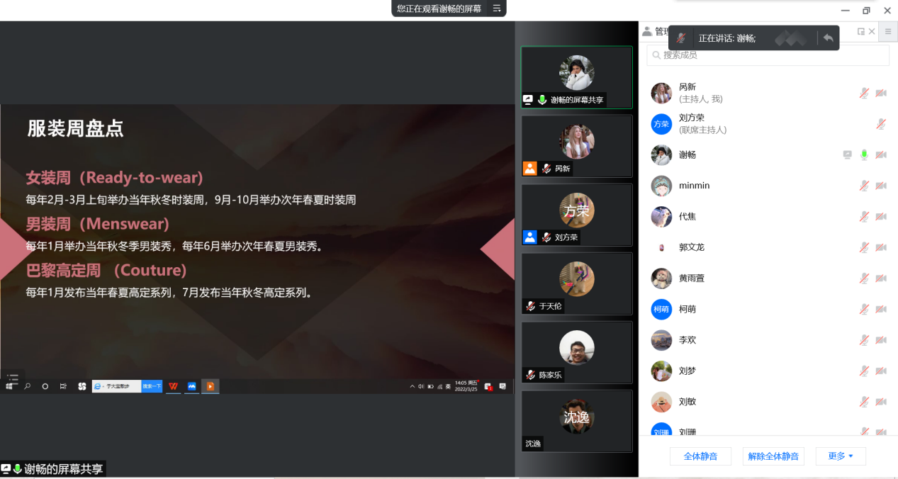 会议伊始,谢畅同学分享的主题为“服装周热点词汇特征及翻译实践探讨”。首先,她简单介绍了三类不同的时装周的概念,然后从举办时间地点、主办方、品牌和服饰特点方面详细阐述了国际四大时装周:巴黎时装周(Paris Fashion Week)、纽约时装周(New York Fashion Week)、米兰时装周(Milan Fashion Week)、伦敦时装周(London Fashion Week),同时也提到了中国国际时装周(China Fashion Week)。