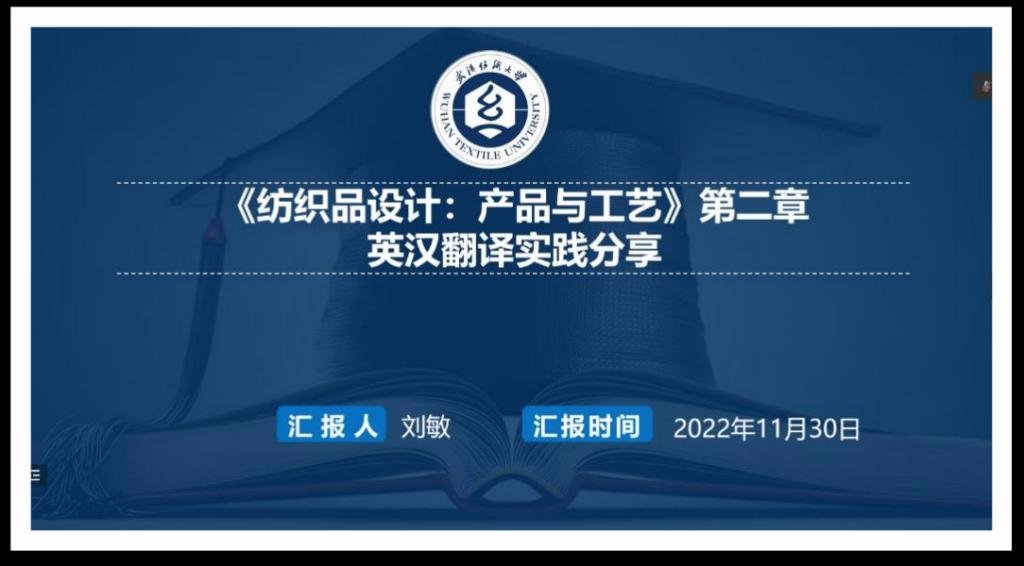 第三位汇报人刘敏同学的主题为《纺织品设计:产品与工艺》第二章英汉翻译实践,分享包括任务介绍、案例分析和总结反思三方面。刘敏首先介绍了翻译实践报告的原文本《纺织品设计:产品与工艺》及其作者英国利兹大学设计理论教授迈克尔·安德鲁·汉恩,随后分析了本书的目标读者。在具体案例分析中,刘敏介绍了尤金·奈达的功能对等理论,从词汇对等、句法对等、篇章对等及文体对等四个方面展开,将翻译理论切实地运用在实际案例之中。刘敏指出,科技文本与其他文本的最大区别就在于其具有大量的专业术语,为让目标语读者准确理解原作含义,在翻译过程中要做到词汇对等,但所谓词汇对等并不是中英文一一对应,而是要做到功能上的对等。