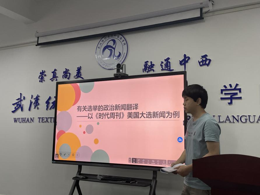 第二位汇报人胡陈一同学以《时代周刊》美国大选新闻为例,分析了美国大选的政治新闻翻译。其汇报分为美国选举制度简介、翻译实例分析以及翻译总结三个部分。胡陈一首先结合图文,对美国选举制度进行简要分析,然后从词汇和句型以及立场三方面深入剖析其新闻文本英译汉翻译实践。最后,汇报人总结了翻译此类文本的翻译技巧,即在词汇层面,需注意专业词汇及隐喻词汇的处理;在句型层面,某些句式需断句,重新组织语序;在立场层面,需重视文本的政治敏感性,可依据具体情况对译文进行适当增减。