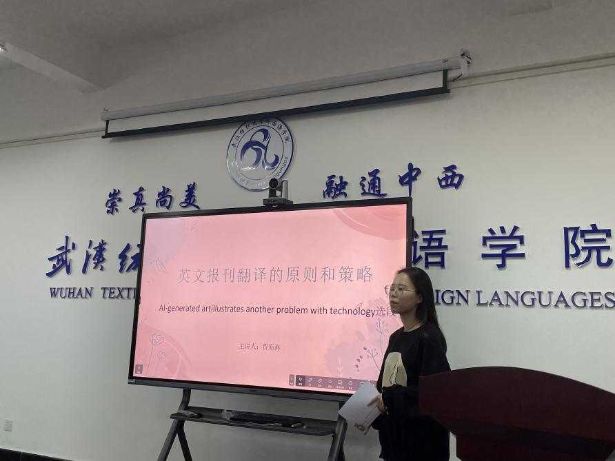 第三位汇报人贾斯淋同学结合具体文本,讲述了英文报刊翻译的原则和策略。汇报分为英文报刊介绍、实例翻译以及总结三部分。贾斯淋从基本特征、翻译标准以及翻译策略三方面着手,对英文报刊翻译做出详细介绍。紧接着,她逐词逐句分析AI-generated artillustrates another problem with technology一文,并将官方译文与自己的译文对照,与大家探讨最佳译文。如 “an internet troll”可译为“网络喷子”,形象生动且接地气;又如单词“hack”,依据上下文,应将其译为“记者”而非“黑客”。最后,贾斯淋总结出报刊翻译需注意的四大点:1.标题翻译需规范;2.熟词僻义需留意;3.翻译腔要避免;4.传达信息需清晰。