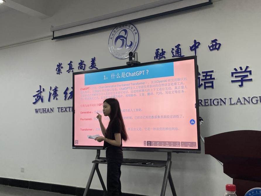 第一位汇报人武静波同学的主题是ChatGPT时代翻译行业面临的挑战与机遇,武静波的汇报分为五个部分,均以疑问句作为标题,激发观众兴趣。她的分享从ChatGPT本身发散到其对翻译行业的影响,层层递进、引人深思。武静波首先从简介、价值、优势三方面对ChatGPT展开了详细介绍,然后结合具体翻译实例,分析ChatGPT的翻译准确程度。在此过程中,同学们深切体会到,机器只有“芯”,而人有“心”,AI翻译永远不可能取代人工翻译,翻译行业也绝不会是夕阳产业。同学们理当潜心钻研,勇攀高峰,勇做人工智能的驾驭者。