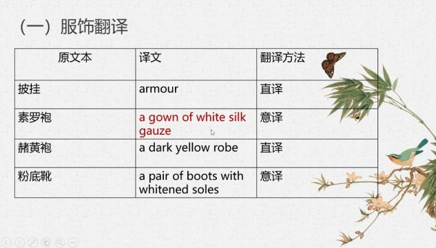 第三位汇报人何江坪同学分享的是《西游记》中的服饰翻译。在简介《西游记》这部小说后,她对小说人物中服饰描绘的作用和西游记中的服饰描写做了介绍,然后她根据服饰、头饰、配饰的分类,对具体服饰的翻译做出分析和解读。