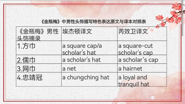 第一位汇报人余意同学分享的是文化语境视角下的《金瓶梅》男性头饰英译探索。他首先阐述文化语境视角理论,包括语境起源、语境类型和文化语境的含义,然后介绍作品《金瓶梅》及其比较有代表性的埃杰顿译本和芮效卫译本。在主体分析部分他分析了方巾、儒巾、网巾和忠靖冠等男性头饰的英译。