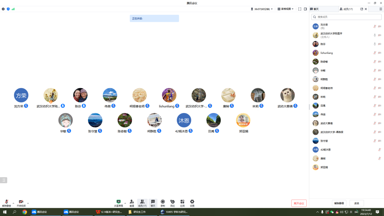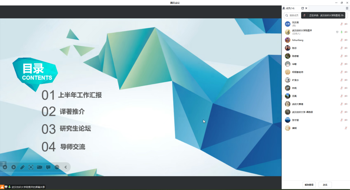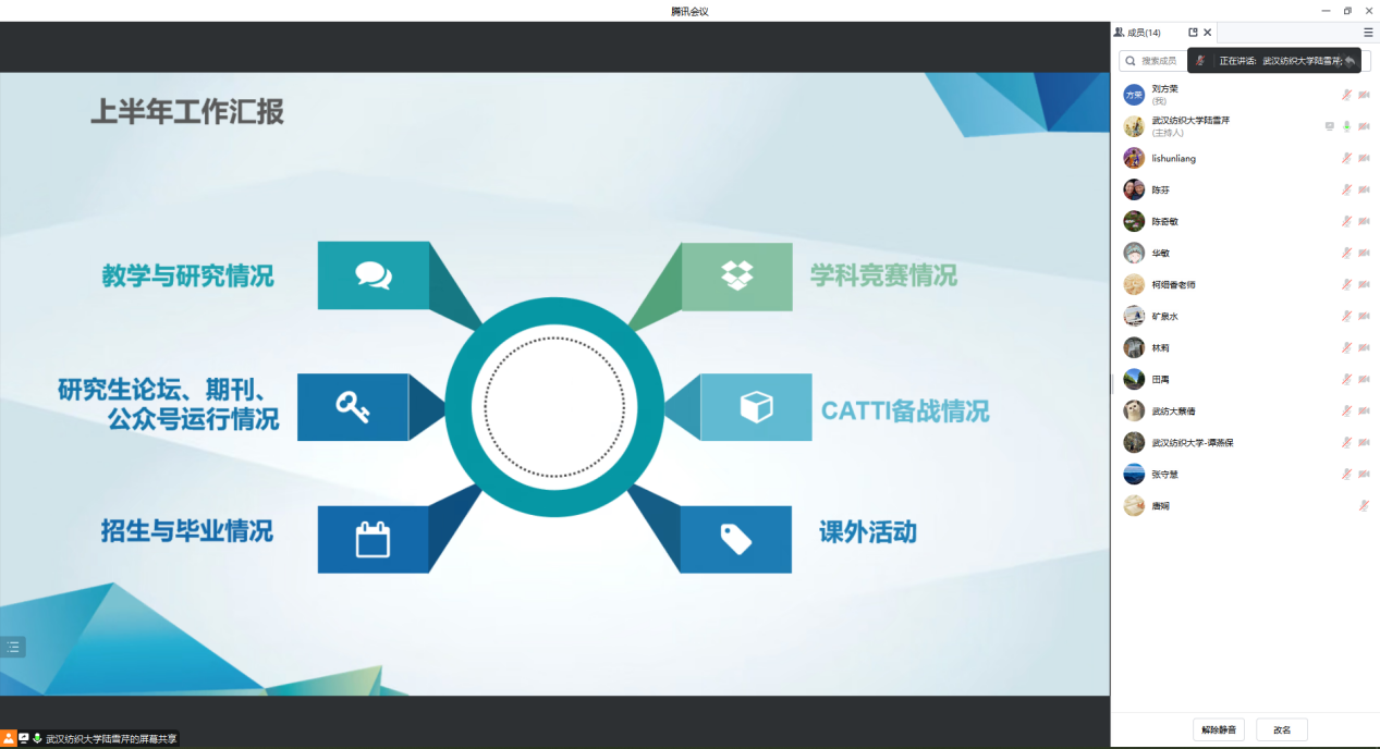 7月12日晚七点半,MTI教育中心利用腾讯会议举行了2023年上半年工作总结会议,硕士生导师及MTI教育中心管理人员参加了会议。会议由MTI教育中心副主任陆雪芹老师主持。
