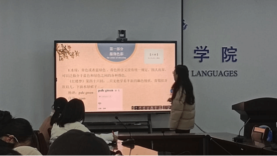 第一位汇报人吴静雯同学分享的主题是《红楼梦》服饰翻译。首先,她详细讲解了翻译家杨宪益在进行服饰色彩翻译时运用的翻译方法,并使用色卡对颜色的区分加以分析优化。在此基础上,对比杨宪益和霍克斯关于贾宝玉服饰的翻译,分析两个译本的优缺点。最后,对《红楼梦》的服饰翻译进行总结:在翻译过程中应尽力去了解源语言国家的服饰文化,深入研究其历史背景,才能够更准确地传达原文本中的信息。