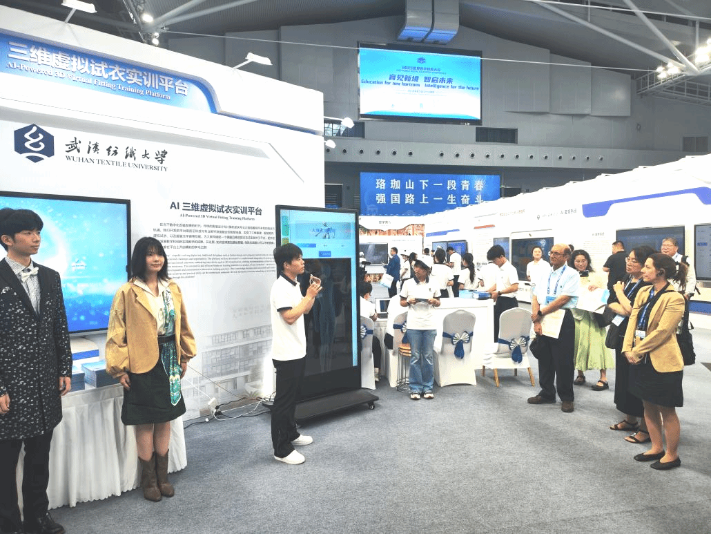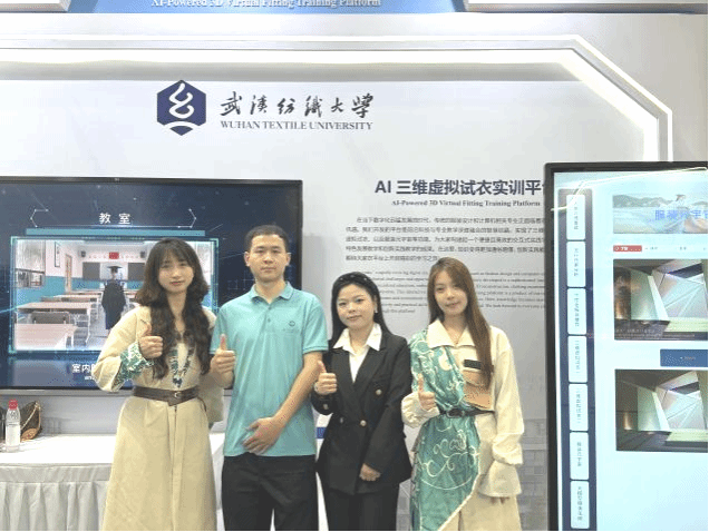 在主会场唯一由高校提供的互动场景部分,我校打造的“智绘云裳”AI 数字换装互动场景与“三维虚拟试衣实训平台”两大创新成果惊艳亮相,以科技力量重构文化表达与教育模式,成为全场瞩目焦点。ok138cn太阳集团52923级MTI研究生周华科和钟依恋作为讲解员代表,向全球嘉宾展示了我校AI 3D虚拟试衣实训平台,彰显了我校在教育数字化领域的创新实践成果,为中外教育交流搭建了重要桥梁,也展示了我院MTI研究生的风采。
