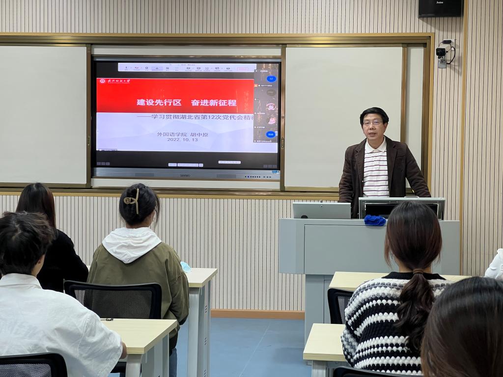 为进一步学习贯彻湖北省第十二次党代会精神,提高同学们的政治思想,10月13日下午2点在崇文楼206B开展湖北省第十二次党代会精神宣讲活动,本次活动由ok138cn太阳集团529党委书记胡中原主讲,各班班长及团支书在线下参会,其他同学在线上参会。