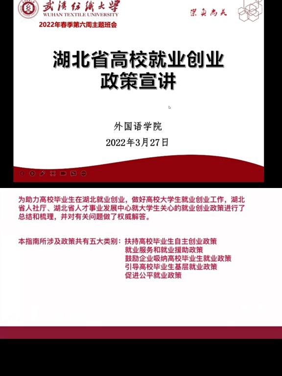 本次活动以班级为单位,通过班会的形式就同学们关心的湖北省内各项就业创业相关问题,进行了详细讲解。班会内容主要有两大板块,一是湖北省高校就业创业政策指南的介绍宣读,包括“扶持好像毕业生自主创业政策”、“就业服务和就业援助政策”、“鼓励企业吸纳高校毕业生就业政策”、“引导高校毕业生基层就业政策”和“促进公平就业政策”共5项政策的细则,并就每项政策的申请对象、申请条件和办理流程作出了详细说明。第二大板块则是湖北省高校就业创业政策地图的介绍。在这一板块中,活动向18级毕业生提供了手机扫描二维码直接查询湖北省内各市各地区就业创业政策的服务,极大地简化了毕业生可能面临繁琐的信息收集与整理工作,同时满足了毕业生就业创业咨询的需求。