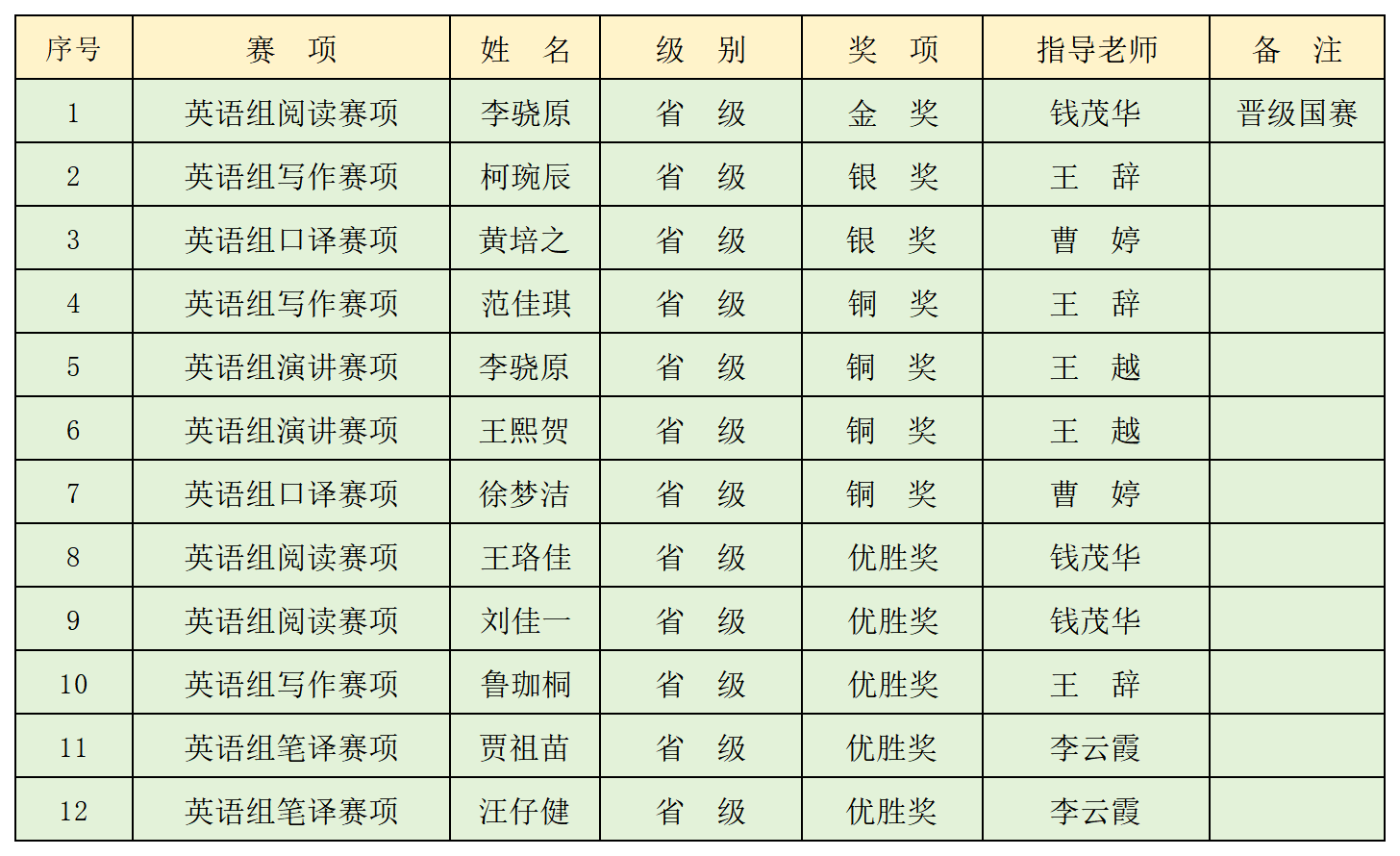 我校英语专业是国家级一流专业建设点,突出“以学生为中心”,落实立德树人,致力于培养语言基本功扎实,具有深厚人文素养和健全人格,具有家国情怀、跨文化能力以及思辨与创新能力的语言服务人才。近年来,英语类专业积极组织学生参加学科竞赛,以赛促学,取得了良好成效。
