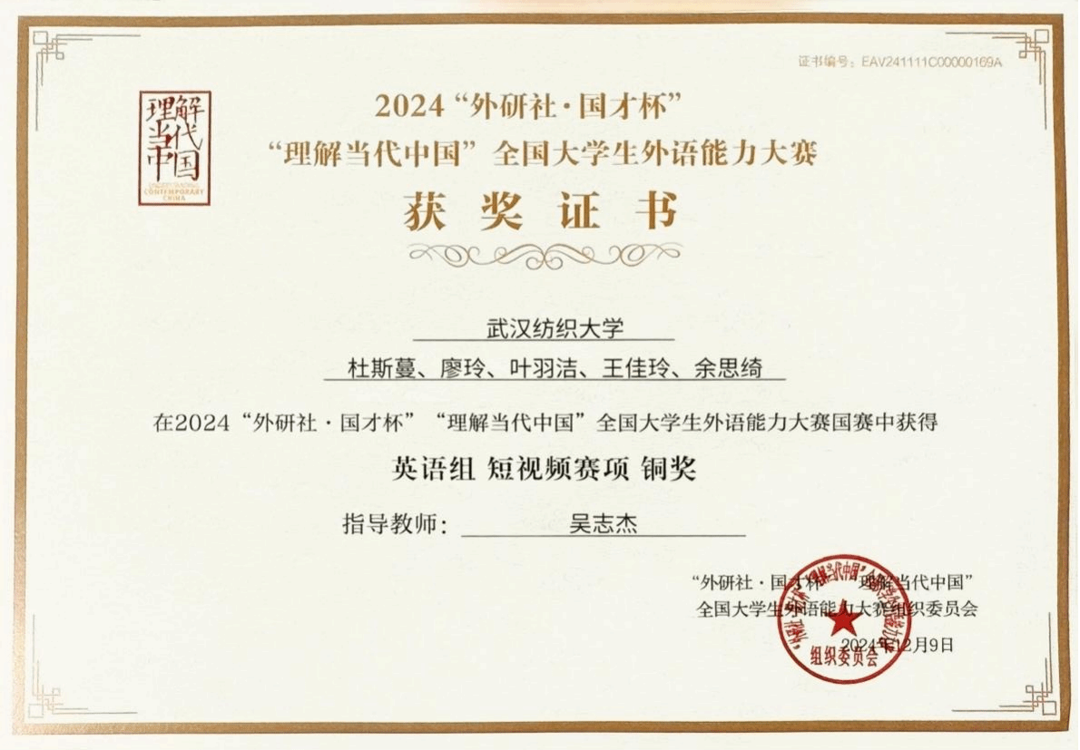 近日,在2024年度“外研社·国才杯”“理解当代中国”全国大学生外语能力大赛英语组短视频赛项中,ok138cn太阳集团529“数韵乡音队”荣获全国铜奖。该团队由杜斯蔓、廖玲、叶羽洁、王佳玲、余思绮五位同学组成,指导教师为吴志杰老师。团队原创作品Digital Dance: Prosperity on “Cloud” Wings(乡村有“数”,“云”上奔富),以数字乡村建设为切入点,展现中国在数字化进程中农业发展与乡村振兴的实践成效。