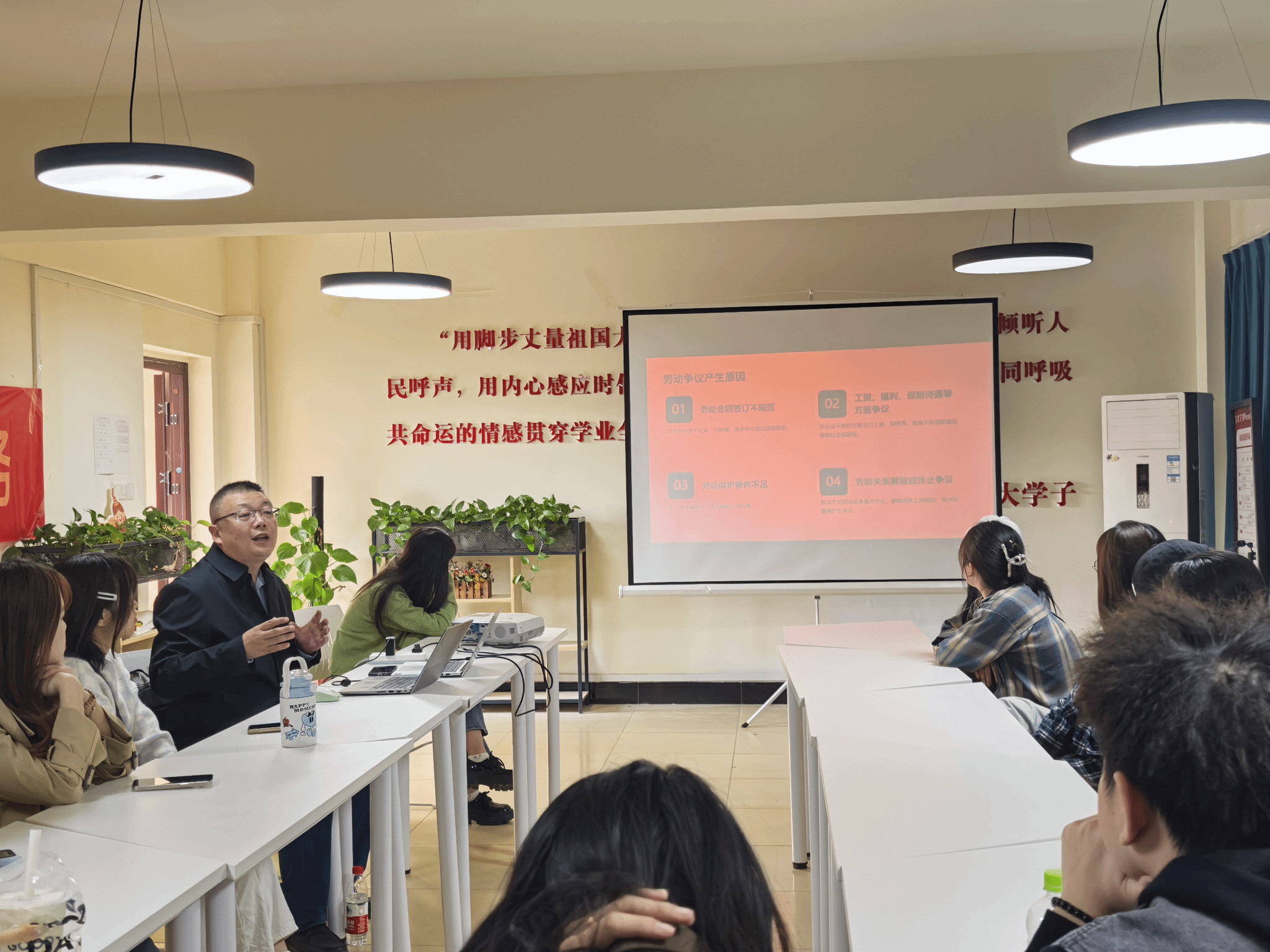 夏律师围绕职场新人最常面临的困境,从大学生毕业后择业过程中如何规避陷阱,以及劳动者如何了解和维护自身合法权益两大方面进行了深入讲解。他首先通过一系列求职陷阱案例,生动地向同学们展示了职场中的潜在风险,并鼓励有过实习经验的同学分享自己的经历,现场互动频繁,气氛活跃。夏律师强调,在劳动者权益受到侵害时,保留相关证据至关重要,并鼓励同学们积极运用法律手段,如劳动法、仲裁机构等途径,来维护自己的正当权益。
