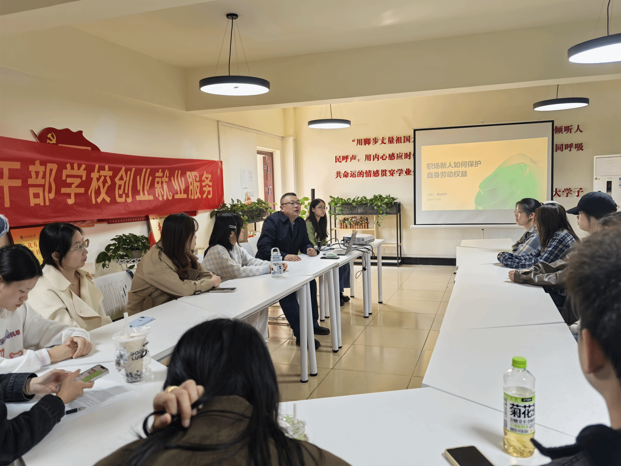 为增强同学们初入职场的信心,提升女大学生劳动权益的保护意识,11月7日,由招生就业处联合武汉市妇联举办的成长导航巾帼创业荟女大学生创业就业宣讲活动走进ok138cn太阳集团529读“习”有声学生成长服务站。本次活动邀请了知名律师夏斌以“职场新人如何保护自身劳动权益”为主题,开展主题讲座,吸引了众多即将步入职场的女生参与。