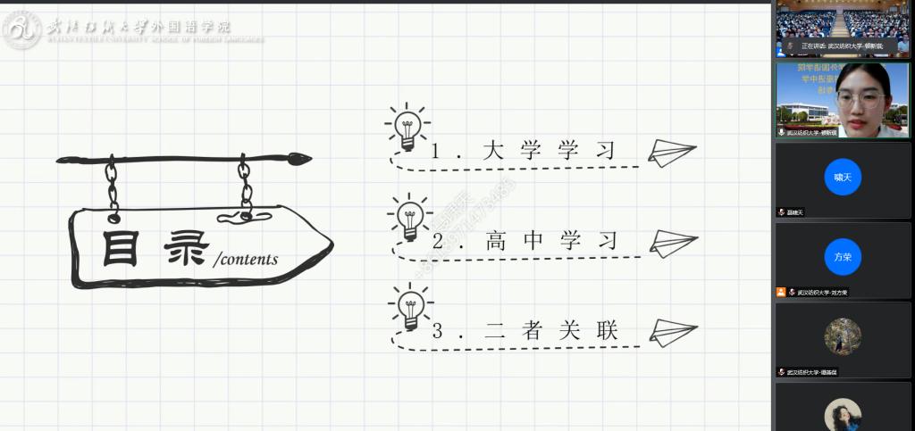 研究生代表顿新琪以《脚踏实地厚积薄发》为题,从英语专业课程、社团、实践、比赛、考试等方面介绍了大学学习状况,并通过比较大学和高中不同阶段学习的特点异同,从宏观和微观两个角度讲解了学习方法和应试技巧,最后以“窗外有风景,笔下有前途,低头是题海,抬头是未来”为现场学生将来的高考加油打气。