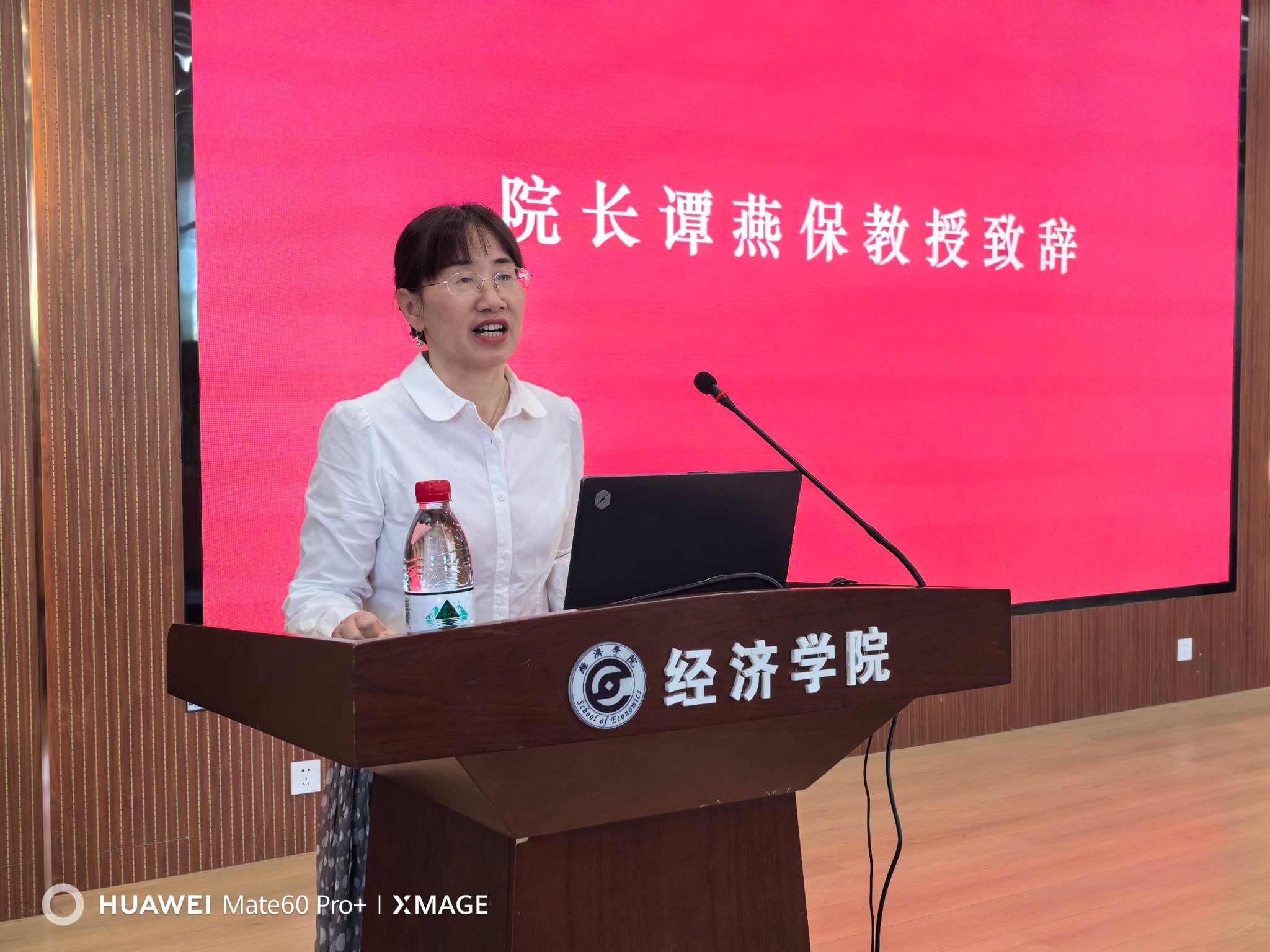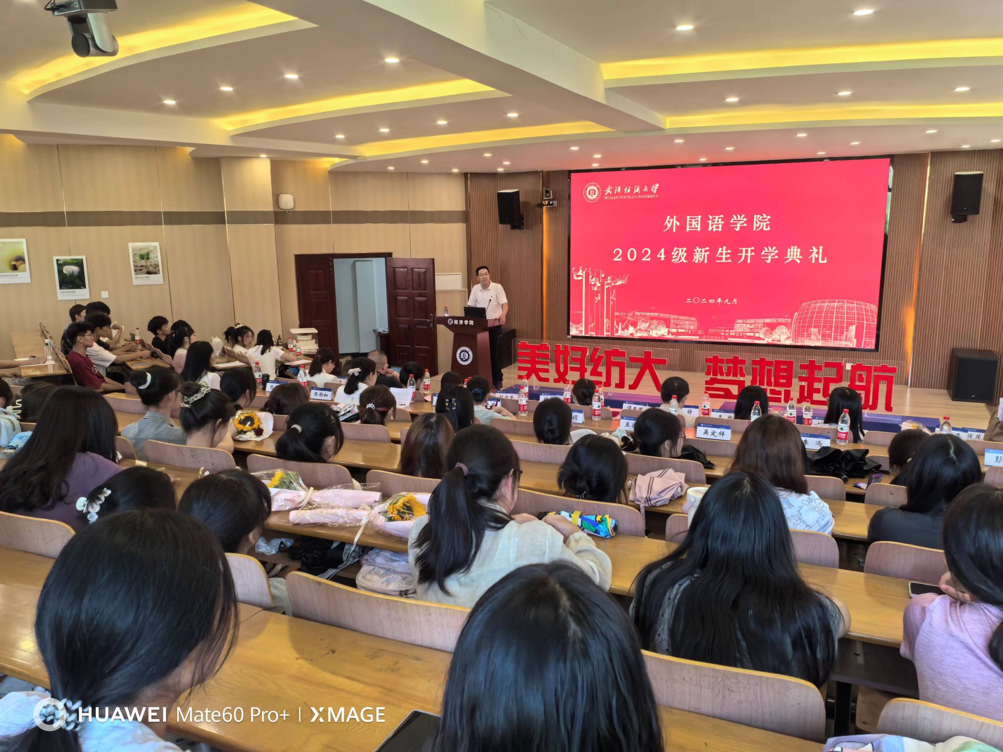 胡中原代表学院欢迎2024级新生的到来,致意全体新生从进入纺大开始就有了“纺大人”这一新身份。胡书记娓娓道来优秀校友的故事和校园环境的点滴变化,鼓舞全体新生在最宝贵的年华、在最美丽的校园养成终身学习的习惯,并用“四新”祝福全体新生:“跨进纺大新校园,谱写外院新篇章,勇攀人生新高峰,再创学业新辉煌。”