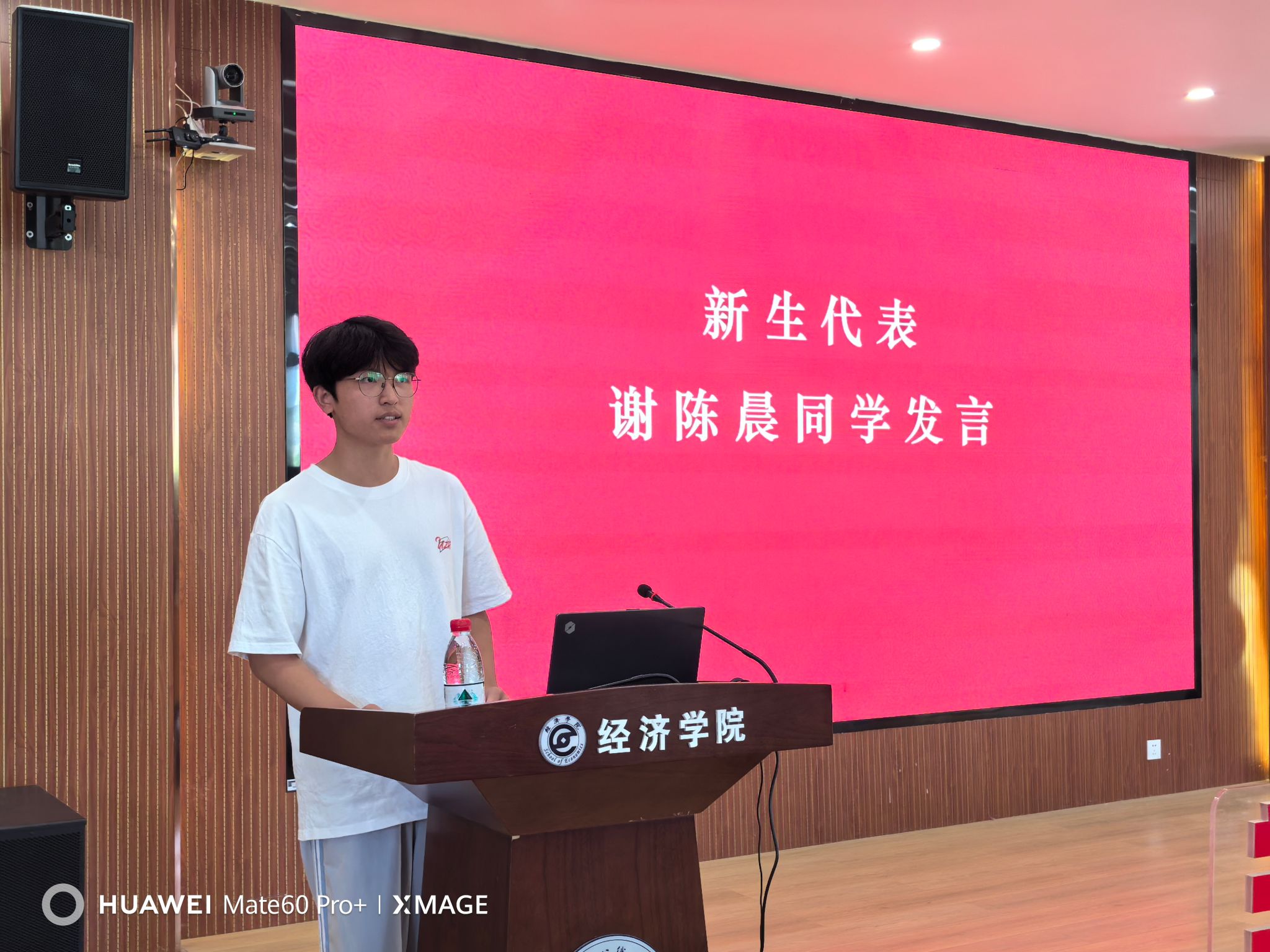 英语12401班谢陈晨同学作为新生代表发言,号召大家一起积极参加体育运动、探索兴趣爱好,融通中西,扎根祖国文化历史,深入英语学习和能力全面提升,立志成为文化传播的使者、国家发展的栋梁。