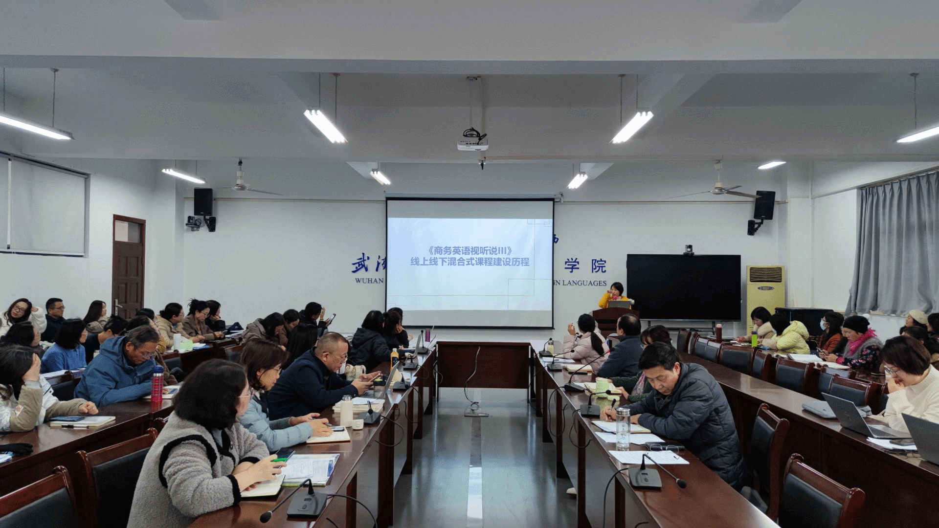 吴凤竹分享了“《商务英语视听说III》线上线下混合式课程建设历程”。她首先介绍了该课程建设的缘起,然后详细介绍了该课程的建设过程,包括课程资源、校级混合式教改项目、教学设计与实施、教学数据、课程周边、课程应用等6个方面。最后她重点分享了如何进行申报以及申报中的注意事项。