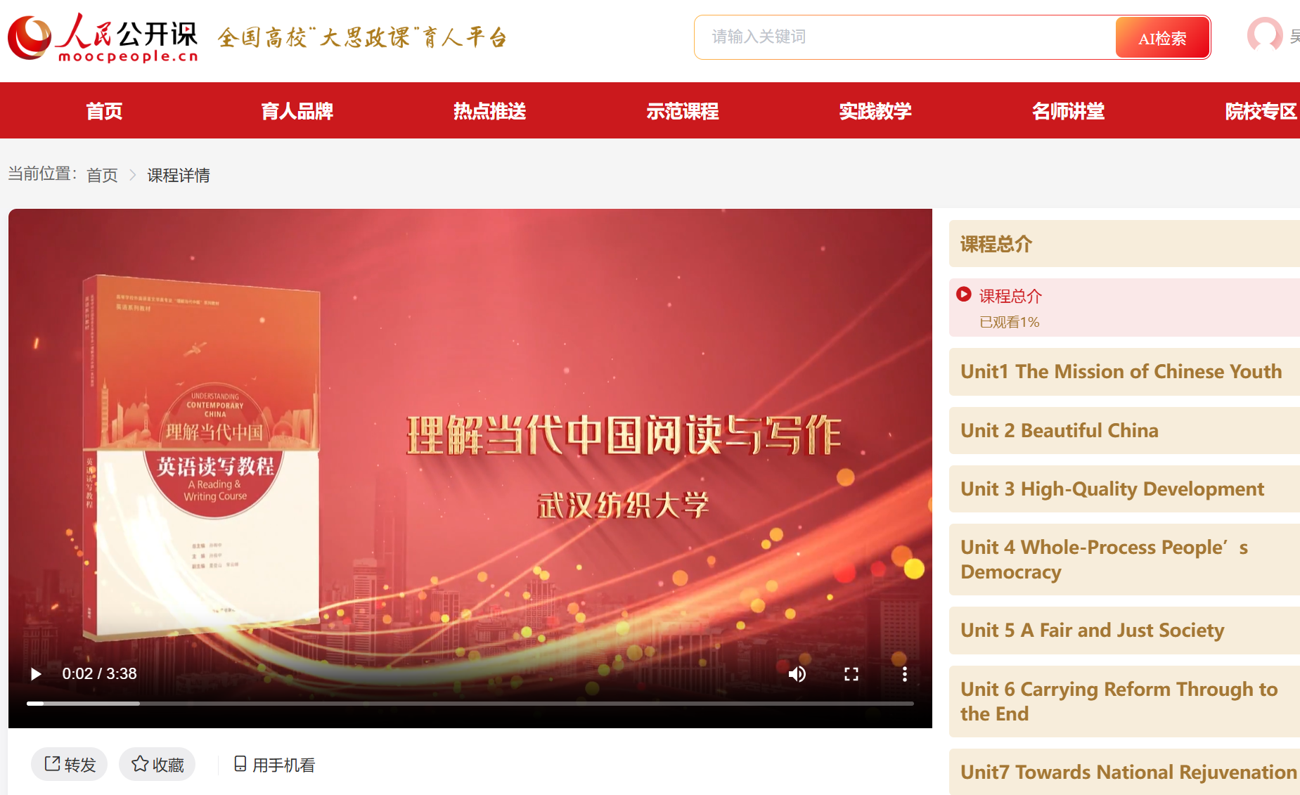 近日,ok138cn太阳集团成为湖北省首家将“理解当代中国英语阅读与写作”全课程资源正式上线人民网人民公开课国家级平台的高校,面向全国公众及广大师生开放。此举标志着ok138cn太阳集团在“理解当代中国”系列课程的建设与推广上迈出了标志性的一步,从校内走向全国,为学校先进教学成果提供了更广阔的展示与共享舞台。