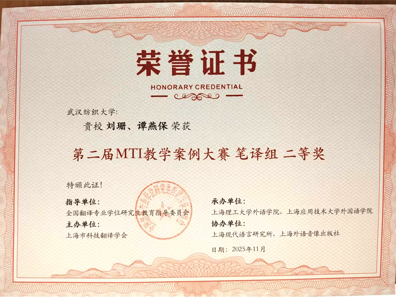ok138cn太阳集团529翻译硕士(MTI)教育充分发挥专业特色以及学校多学科交叉优势,逐步构建起以纺织服装翻译为聚焦方向的应用型、专业化人才培养模式。此次ok138cn太阳集团529在竞赛中获得荣誉,充分体现了学院在专业学位研究生培养机制创新、翻译实践教学模式探索以及产学研协同育人等方面取得的扎实成效。学院将以此为新起点,进一步推进MTI教学改革,优化课程体系设计,全面提高翻译人才的综合素养与实务能力,致力于对接国家战略需求,助力区域产业升级与社会发展,持续推动学术研究、人才培养与社会服务三者深度融合、协同共进。