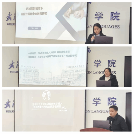 周丹分享了“区域国别视域下英格兰中文国际教育”。她根据在海外的亲身观察介绍了中文国际教育在英格兰---从社区层面跃升到国家层面---的变化过程,分析了其中的原因。周丹认为英格兰的中文教育为其他国家的国际中文教育提供了经验和可借鉴的样本。郭艳红介绍了她的2026年教育部人文社科青年项目“互动语言学视域下的汉语弱化并列连词研究”的选题原因,研究内容,研究方法和计划。谢易从选题依据、研究内容、思路方法、研究基础、预期成果等方面介绍了自己的国社科选题“数智时代大学英语教师教学投入影响因素和精准支持路径研究”。朱灵慧对三位老师的分享做了点评并提出了修改建议。