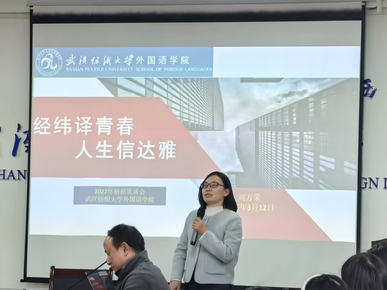 刘院长以“经纬忆青春,人生信达雅”为题,讲述了自己“三战”考研、从高中教师到高校副教授的奋斗历程,真诚勉励学子“一旦决定考研,便不再动摇,全力以赴”。她还详细介绍了学院在学科建设方面取得的成果,特别是MTI翻译硕士学位点的办学特色、招生政策与培养路径,鼓励学生立足本校优势,稳扎稳打,实现学业与人生的跃升。