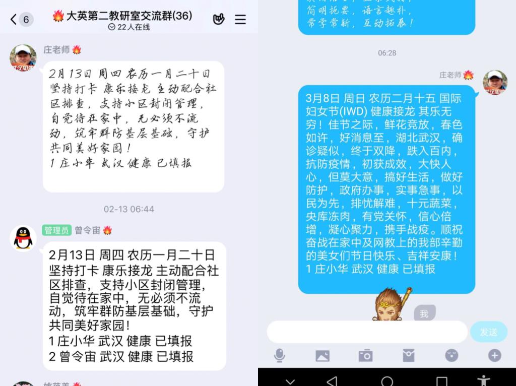 部门接龙打卡,企业微信健康填报,他总是积极响应支部书记兼主任杨雪老师的号召,早起带头,冲锋在前,并每日更新正能量台头语,激励大家快乐接龙,积极抗疫。引领部门全员按时签到打卡,已连续坚持了一月有余。