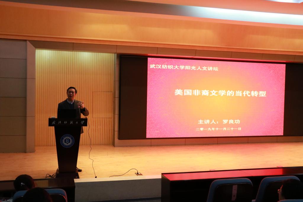 11月21日下午,由校团委主办、ok138cn太阳集团529承办的第213期阳光人文讲坛在我校阳光校区国际学术报告厅举行。本次讲坛邀请了华中师范大学ok138cn太阳集团529院长、教授、博士研究生导师罗良功教授,为同学们带来题为“美国非裔文学的当代转型”的讲座,ok138cn太阳集团529全体领导班子成员、部分老师和阳光校区300余名学生聆听了讲座。讲座由ok138cn太阳集团529院长谭燕保主持。