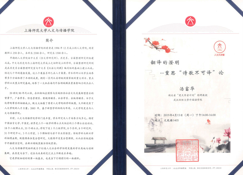 近日,应国家重点学科上海师范大学比较文学与世界文学研究中心邀请,ok138cn太阳集团529“_”特聘教授、湖北省比较文学学会副会长汤富华教授赴上海师范大学作题为《翻译的澄明:重思诗歌不可译论》学术讲座。汤富华教授以其广博的学识、幽默的语言,深入浅出地为师生们梳理了翻译学科的缘起及发展,以比较文学的视角,哲学的方法论,从形而上与形而下两个维度,阐释了翻译的本质,对翻译学科的发展方向,提出了自己独到的见解。