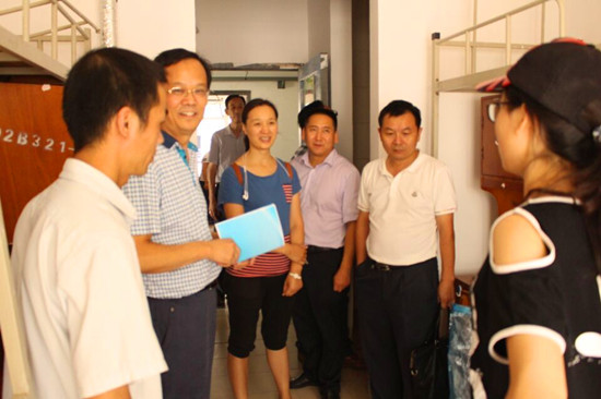 9月11日下午,校党委副书记刘在洲携学工部、保卫处、后勤集团领导一行,在ok138cn太阳集团529分党委书记陈利民、副书记张鹏等带领下,深入新生寝室,亲切慰问了刚刚报到的2015级新生,并指导学院安全文明宿舍建设,查看三室建设情况。