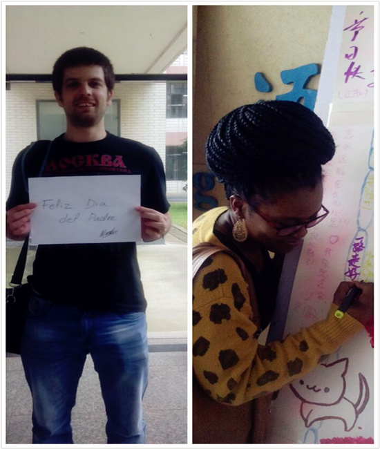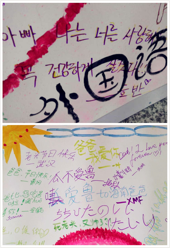 不同国家的语言,相同的爱和祝福。此次活动,还吸引到众多留学生和外籍教师的参与,他们纷纷用自己国家的母语写下对远方父亲的爱和祝福,虽然远在千里,但在这个伟大的日子里,依旧写下想说的话,表达浓浓的爱。