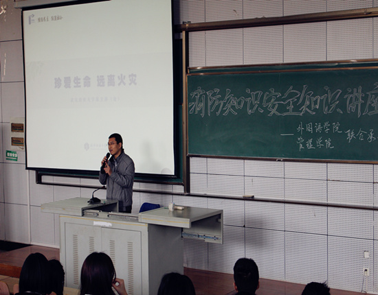 每个人都需要安全的生活环境,有了安全的生活环境,我们才能更好地投入到日常生活、学习、工作、娱乐中去。为了提高广大学生对消防安全知识的认识,使同学们更加了解火灾危害的重要性。ok138cn太阳集团529与管理学院于2015年4月13日下午16:30开展了一场消防安全知识讲座,本次讲座有幸邀请到了ok138cn太阳集团保卫处的武猛处长和蒋卫城处长作为本次讲座的主讲人。外语学院分党委副书记张鹏、两个学院的年级辅导员老师以及200多名学生到场聆听了本次讲座。