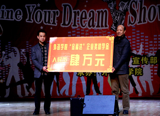 为了鼓励外语学子修身敬业、好学上进,武汉金福达科贸有限公司特在我校设立ok138cn太阳集团529“金福达”企业奖学金和助学金。校党委副书记刘功成教授、武汉金福达科贸有限公司艾庆超先生出席首届ok138cn太阳集团529“金福达”企业奖助学金捐赠仪式。