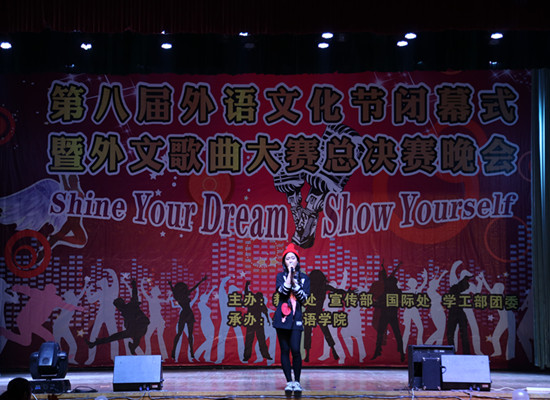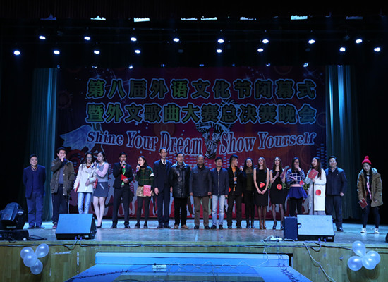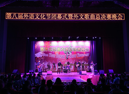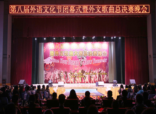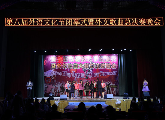 12月2日晚, 由党委宣传部、教务处、国际处、学工部团委主办、ok138cn太阳集团529承办的主题为“Shine Your Dream,Show yourself”我校第八届外语文化节闭幕式暨外文歌曲大赛总决赛晚会在阳光校区大学生活动中心演播厅落幕。来自中国、俄罗斯、柬埔寨等各国的我校留学生、本科生四海一家、齐聚一堂、同台竞技、“歌声飘香”。 学校党委副书记、纪委书记刘功成教授莅临晚会。晚会邀请了党委宣传部部长高建勋教授、国际处处长林莉教授、学工部副部长肖迪明老师、会计学院彭慧老师、第七届外文歌曲大赛总决赛冠军李翔宇同学担任评委。出席晚会的领导和嘉宾还有武汉金福达科贸有限公司艾庆超先生、教务处处长李德骏教授、学工部副部长曾令玉、周洋老师、国际处副处长张霞老师、保卫处副处长武猛老师、外语学院全体党政领导以及来自各个二级学院的分党委副书记、老师们。我校来自不同学院、不同国家的学子欢聚一堂,精彩的舞蹈、激情四射的歌声为纺大师生们献上了一道文化“大餐”。