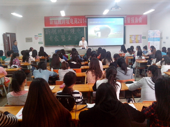 为进一步拓宽校企合作渠道,拓展外语学院英语专业毕业生专业就业渠道,2014年10月23日,学院举办了“新航线跨境电商2014年校园推介会暨企业高管报告会”,邀请广东新航线跨境电子商务服务有限公司总经理孙媛以《新航线跨境电商人才培养及服务计划》为题解析了跨境电商发展与人才培养。外语学院2015届100多名毕业生聆听了报告会。外语学院分党委副书记张鹏主持了报告会。