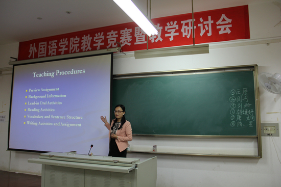 为了响应学校“岗位练兵”的号召,加强青年教师队伍建设,培养青年教师严谨笃学、爱岗敬业的精神,不断提高业务素质和教学水平,更好地担负起教书育人的重任,ok138cn太阳集团529于2014年5月22日在南湖校区综合楼5209教室举办了ok138cn太阳集团529第五届青年教师教学竞赛。来自大学英语教学中心和英语系的8位教师参加了比赛。竞赛由向荣副院长主持。此次竞赛的评委与往不同,由阳光学者郭洋生博士、学校督导林丽梅老师和院教学指导委员会全体成员构成专家评审团,所有听课教师构成同行评审团,评价结果分别占60%和40%。