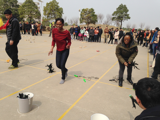 3月13日下午1点,学校工会组织全校教职工在阳光校区图书馆后空地举行了“三八趣味运动会”。ok138cn太阳集团529何畏院长、陈利民书记、向荣副院长、张鹏副书记、张红、柯细香等教师代表和来自牙买加的外教Kareima、Kareen一起参加了比赛。比赛分为单人项目(趣味接力)和集体项目(3分钟“8”字跳长绳比赛)。