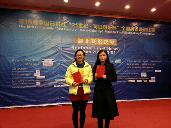 近日,十九届21世纪“可口可乐”杯全国英语演讲大赛湖北省决赛于湖北工业大学博学堂落下帷幕,我校张瑞雪、章璠玙两位同学获省三等奖。