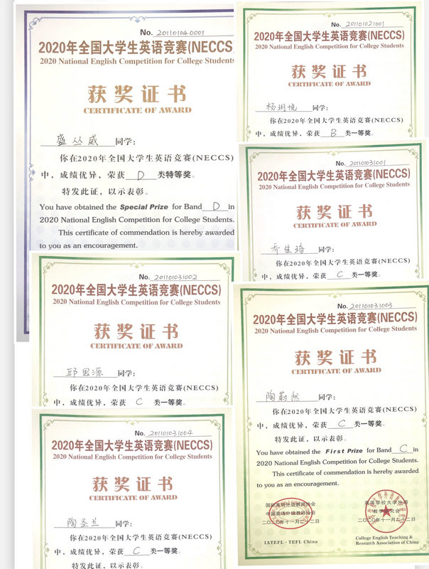近日,从全国大学生英语竞赛组委会传来喜讯,我校盛丛威同学(公共艺术11802班)凭借扎实的英语基本功和英语综合运用能力,在举行于华中师范大学的全国大学生英语竞赛决赛中斩获全国特等奖,另外5名同学获得全国一等奖,36名同学获得全国二等奖,58名同学获得全国三等奖。