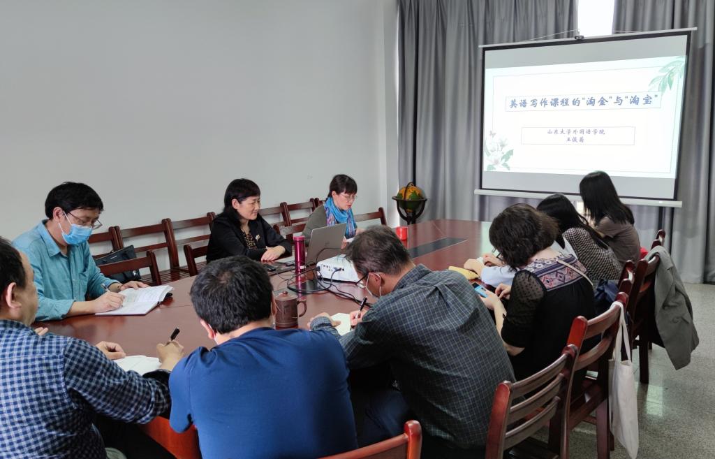 5月14日,山东大学ok138cn太阳集团529院长、博士生导师王俊菊教授来我院作了题为“英语写作课程的‘淘金’与‘淘宝’”的专题讲座。讲座由ok138cn太阳集团529院长谭燕保教授主持,ok138cn太阳集团529党政领导班子、骨干教师通过线上、线下两种方式参与了本次讲座。