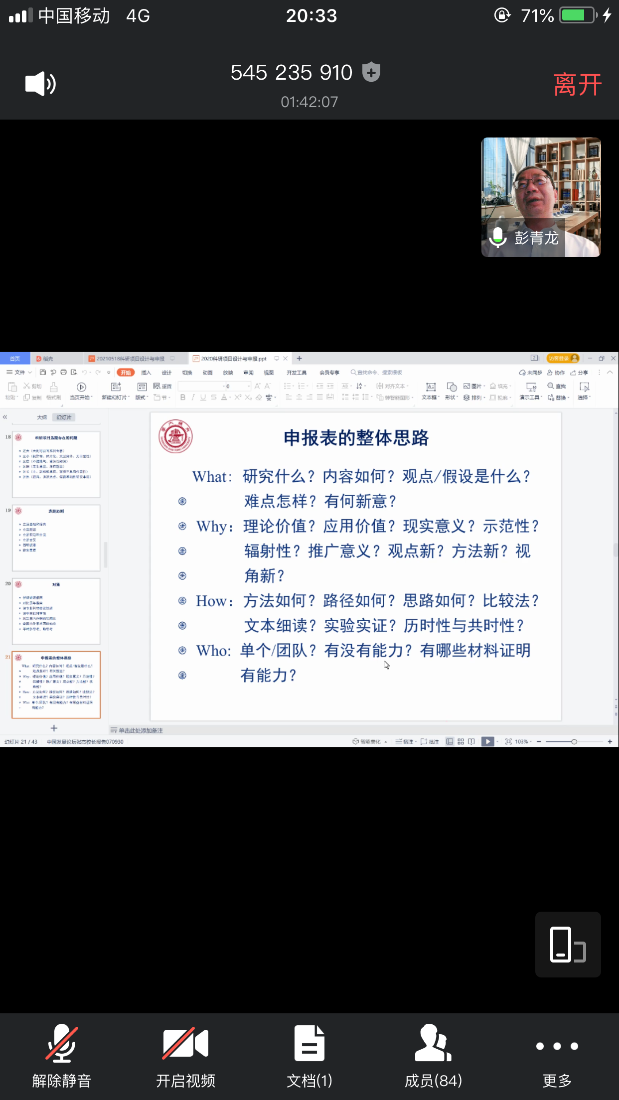 彭青龙教授从青年教师的发展出发,强调在新文科背景下,青年教师要养成阅读思考的习惯,掌握学科前沿的研究领域和研究热点,他认为在当前外语教育多元化、教师发展职业化和专业化以及学科条块化的背景下,教师专业发展呈现出“自我调节”、“持续性”、“动态性”、“过程性”的特点。针对以上特点,他从“教育国际化前沿”、“外语教育教学前沿”、“跨学科研究前沿”以及“文学学术前沿”等方面给出了相应对策。接着彭青龙教授梳理近些年国家社科外国文学方向的申报指南,解读了该领域的研究热点,并且从评审专家的视角提出了项目申报中出现较多的问题及相关对策。最后,彭教授重点解释了项目申报中what,why,how,who的内涵,详细解析了科研项目申报表的整体思路、国内外研究现状、课题价值、研究方法、研究队伍、研究内容、研究思路与方法﹑创新之处等方面的写作技巧。